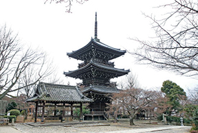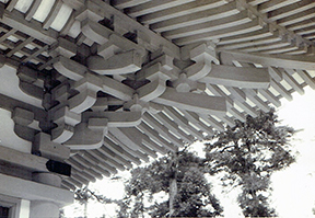 産寧坂から望んだ八坂の塔 寺の街と言われている程の京都でも、現存する塔は存外少ないものである。応仁の乱と禅寺の多いため、と私なりの解釈をしているが、それでも五重塔が四基、三重塔が三基と、他の都市と比較すれば、はるかに多い数を有しているのは、やはり、京都ならではの感がある。元来、仏舎利をまつるストゥ―パの発展したものとして、塔のもつ意味は宗教的に重要なものだったが、建築学的にみるなら、それは、むしろ伽藍を飾るものとしての意味の方が強く、宗教的な威圧といったものは感じさせない。だから、高く聳える塔を仰ぎ見る人々は、日本人の心の故郷的な気持で、大方は心持よくこれを迎えるに違いない。その点では、封建制度の象徴たる城の天守閣が、時代によって、あるいは、身分によって、かなり異なった見方をされているのに反し、今も昔も、塔をいつくしむ心にはさして違いはなかろう。その塔が、特に他の堂宇と異なった迎え方をされている理由は、いつにその高さが故だと思う。他の堂宇が如何様雄大であっても、それは所詮大地にはいつくばった、いわば、大地から逃れられない悶々とした姿であるのに反し、塔は天に向かってすこやかにそそり立つのである。西洋中世のゴシック建築が、天への憧れを示すため、大地を離れその尖頭を天空高く聳えたたしたように、塔には、天に対する人間の憧れや悦びがこもっているように思えるのである。そのために能う限り高い塔を求めること、これは、人間の自然の姿だと言えよう。重衡の兵火によって焼失する前の東大寺の七重塔は、その高さ百米にも及んだと言われている。ちょっと信じ難い話しだが、天下の富と勢を有した聖武天皇ならば、かかる雄大な発想は可能だし、どちらかと言えば、当然のように思えてくる。天平の御代はそんなことの可能な時代だったのだし、塔にこめられた人々の願いも亦、無限の高さを求めたに違いないからだ。