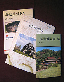 『松江城再発見』など3冊 畏友西和夫君の訃報に接したのは学友T君からの電話でした。松の内が過ぎて間もなくのことで、聞いた瞬間は、信じられない思いでした。この年に受けた賀状には「身体の動くうちは各地へ出かけて行って、歴史と文化を大切にするお手伝いをしたい」、と書かれていましたので、例年のように今年も元気で、国内各地の街づくり、文化財の調査・保護といった活動で忙しいのだろうな、と思っていました。それだけに、信じられない思いだったわけです。賀状を読んだ時点ではまったく気づかなかったのですが、よくよく読んでみると、例年なら、前年に関係した仕事の列記と、新しい年の抱負について希望に満ちた文面で書かれていたものでした。それなのに、今年は、書き出しで「7月で77歳になります。ここまで来られたのは先輩、仲間たちなど大勢の方々のお陰ですので、とても有難いことと感謝しています」、と感謝の気持ちだけが述べられ、今年の抱負も「お手伝いをしたい」、と一歩引いた書き方をしています。君自身、なにか感じるところがあったのでしょうか。ご長男のお話では、年末までは忙しかったようで、元旦はふだんと変わらない様子だったのが、2日に胸の痛みを訴え、3日に亡くなられたそうです。お身内の方は、それこそ信じられない、断腸の思いだったに違いありません。葬儀は1月の半ば、無宗教葬で行われました。祭壇は数多くの供花で飾られていましたが、送り主は、わたしが今まで経験したことのないようなお名前が多く見受けられました。お身内、関係したいくつかの大学まではごく当たり前でしたが、その他は、鎌倉建長寺・浅草寺・護国寺・日光二荒山神社といった寺社関係、文化財保存や街づくりに関係した京都・長崎・小田原・松江・唐津といった都市や横浜三溪園などの施設の名、そして出版社が連なっていました。無宗教葬だというのに二、三僧形の方がおられたのはその関係だったのでしょう。いかにも君らしい葬儀でした。