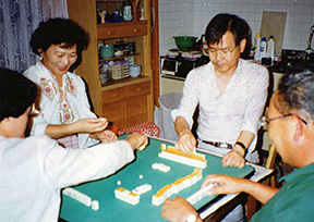 マージャンに興じる 家族ぐるみで古くからお付き合いをしているグループは二組あります。一組は、まだ結婚前、世田谷芦花公園団地の単身寮で親しくしていた3人組で、そのころ同じ団地に住んでいた歴史家の網野善彦先生(故人)を囲む会で指導を受けており、3人の結婚後も家族ぐるみでお付き合いをしていました(仮称「芦花公園の会」)。そのご先生は名古屋大に移られ、一旦会えなくなりましたが、のち神奈川大へもどられて、また顔を合すようになりました。そのころ山荘へご一緒にいかがかとお誘いしたのですが、先生は奥能登時国家の調査(畏友西和夫君も参加)に没頭されていて実現せず、平成4年8月に2家族には来ていただきました。もう一つの組とのお付き合いも古く、わたしが南米からもどったときに同じマンションに居住していた方々で、子供たちの学校関係でつながりのできた、いわばママ友同士の会で、「鵜の会」と称して連携がつよく、そこに夫たちも連なっているという会です。年に1〜2回は持ち回りで食事会を開き、また一緒に海外へ旅したりしていた中です。そんなお付き合いなので山荘へも何度か来ていただいております。昭和63年から平成12年にまでわたっておりますので、その間の経年の差は顕著で、あらためて「まらうと」を開いてみると興味深いものがあります。