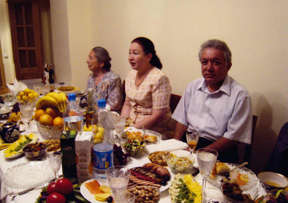 ウズベキスタンでのわたしの業務に当たっては、通訳ドクター・ムハメド(経済学の学位を持ち、奥さんも医学博士)にはずいぶん助けられ、かつ業務をはなれての生活面でも面倒をみてもらいました。写真はウズベキスタンを離れる前夜、彼の自宅での食事にさそってくれたときのものです。写っている人物は、左からドクターの母親(ソ連時代に学士院賞を受賞した高名な歴史学者とのこと)と、ドクターの娘婿のご両親です。テーブルの盛り付けは、タシケントに生活する中流の上と思われる家庭での客をもてなす際の典型的な例ではないでしょうか。テーブルの中央には大皿に盛られた果物の山が置かれるのが普通で、ペットボトル横の皿は生ハム、チーズの盛り合わせ、揚げたようなものはサムサと称する揚げ餃子です。生魚は川魚で、レモンをたっぷりかけて食べていました。全般的に野菜・果物、そして木の実の多いことがお分かりいただけるでしょう。