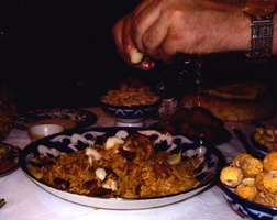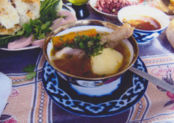 ウズベキスタンでは、際立っておいしい料理があったわけではありませんでしたが、バラエティに富んでおり、テーブルを囲んで一緒に料理を楽しむといった雰囲気を満喫しました。わたしにとって印象深かったのは、行く先々の土地で、そして同じ土地でも、店同士が自分の味を競い合うように作り出していたパンでした。サマルカンドへ行った際は、ここのパンは硬く日持ちがよくて、ウズベキスタンで一番おいしいという評判でしたが、わたしは防腐剤が入っているような気がして、むしろタシケントのパンの方がおいしく思われました。面白かったのは、客をもてなす食卓では、家の主人はまずパンを小さくちぎって、座につく人の位置に放り投げるのです。一見乱暴なような気もしましたが、客は自分でパンを取る手間が省けるわけで、それも客へのサービスかと感心しました。パンの次に注意を引いたのはプロフです。これは油を使って炊き上げたお米を、小さく切った羊の肉や野菜と一緒に大皿に盛りつけた料理で、大切な客人をもてなすために各家庭が自慢とする大切な料理のようです。写真に出したプロフは、会社保養所自慢のものらしく、白く見えるのは採りたてのニンニクで、臭みがなくたいへん美味でした。スープの種類も豊富でした。出汁(だし)をとるために大体が羊の肉を入れるようですが、麺の入ったスープはラグマン、とくに肉の多いスープはショルバと称するようです。