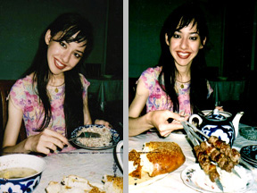 写真の夢花(ウズベク語の名前Babakh Odjaevaが日本語だと「夢」と「花」の意だとのこと)さんは、わたしがサマルカンドの日帰り観光をした際のガイドさんで、日本に留学したことがあり日本語に堪能でした。帰国する直前に、お礼にと食事を誘ったところ、タシケントの交通大学で歴史学を講じているお母さん同伴で、旧市街の庶民的なレストランで純ウズベキスタン風の料理を味わうことができました。たぶん、観光客は寄りつかないような店だったと思います。左の写真、夢花さんが手にしているのは馬肉と麺の生地とを混ぜ合わせたナルン(またはノリン)と称する料理で、ちょっと口にしてみましたが、見かけによらず美味でした。手前のスープにも表面に馬肉から生じたような白色の脂分が浮き上がってきており、一見気味が悪かったのですが味は存外よく、いかにも中央アジアの草原風の料理といったところでしょうか。右の写真はご存じ羊肉の串刺し(シャシリクと称していました)で、一切れの肉のサイズが大きく一本食べるのが精いっぱいでしたが、下にそえられた玉ねぎの細切りと一緒に食すと消化にいいようでした。