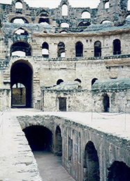 エル・ジェム闘技場内部 エル・ジェム円形闘技場:チュニスでの世界遺産に、必ずしも満足をしたわけではありませんが、エル・ジェムの闘技場には大満足で、感銘を受けました。エル・ジェムはチュニスの南160キロほどに位置する町、案内してくれるというチュニス在住の日本人女性を紹介され、彼女の夫であるチュニジア航空のパイロットの運転する車でそこへ向かいました。町に入り、道路一面をおおうように迫ってくるその姿を目にしたときは、これがローマの闘技場だと興奮しました。世界遺産、それもチュニジアを代表する観光地だというのに、訪れていた人の数は数えるほど、記憶では10人未満だったでしょう。闘技場内を自由勝手気ままに見て回ることができました。ここの闘技場の規模はローマ帝国内でも、大きさからいえばローマのコロッセオ、カプアの闘技場につぎますが、カプアは損傷がひどいことを考えれば、エル・ジェムはコロッセオにも匹敵する円形闘技場だといえるでしょう。外観の損傷が目立ちますが、2度の大きな戦いを経験したためです。はじめは、7世紀のイスラム軍の侵攻時でした。ベルベルのジャンヌダルク、カヘーナ女王がここを要塞化して立てこもったとき。2度目は16世紀に、オスマントルコ軍によって激しく砲撃をされたようです。闘技場内、いたるところにその跡が生々しく残されていました。