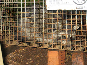 捕獲された2匹の子どもアライグマ 27日の早朝、目覚めてすぐに捕獲器を見に行きました。2匹の子供アライグマがかかっていました。予想に反して、メスのアライグマはすでに子供を産んだあとだったのです。物の本によれば、アライグマのお産は春、それも4月がピークだそうですから、屋根に穴があけられたのは春先で、屋根裏に這入り込み、子供を産んで、親子でわが山荘の屋根裏に住んでいたことになるのでしょう。そう考えてはじめて、ゴールデンウイーク前、アメリカから一時帰国していた下の娘一家と山荘に来たとき、屋根に小さな穴のあることを発見し、そのときは深く考えもせずに、別荘地に出入りの便利屋さんに補修を依頼したことを思い出しました。うかつなことで、腹立たしくもあったのですが、2ヶ月もの間、アライグマ親子に屋根裏を占領されていたわけです。捕えた2匹のアライグマは、処分のために管理事務所経由で鳴沢村役場に持ち込みました。軽トラックに乗せられて運び出されるアライグマ、神妙な顔つきで体を寄せ合っていました。トラックの運転手が「かわいそうだな」と口にしていましたが、たしかに一瞬、憐憫の情がよぎりました。ちなみにアライグマは害獣で駆除対象動物なのですが、一方で「外来生物法」による規制があって、捕獲・処分はやたらにはできず、役所の許可が必要なのだそうです。富士北麓の別荘地の場合、被害が多発ということで、管理人が講習を受講する条件で、管理事務所経由で役場に持ち込めば処分してくれるという特例が出来ており、その点は大いに助かりました。そうでもなければ、専門業者をさがして依頼しなければならず、対応がおくれたことでしょう。この夜、2匹を捕えたにもかかわらず、天井裏では真夜中の4時まで騒々しく、明け方まで眠れませんでした。もしかしたら2匹を失った母親の恨みのこもった仕打ちだったのかも知れません。それに、捕えた2匹以外にも子供がいることも考えられました。