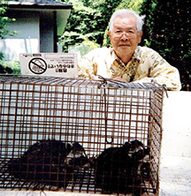 屋根裏にセットした加熱蒸発殺虫剤 29日の朝、一瞬わが目を疑いました。なんとケージ内に母親が神妙な顔をしてうずくまっているではありませんか。大成功でした。体長は55〜60センチ*2の大物で、1人ではトラックの荷台に乗せられず、急遽もう1人の応援をよんだほどで、役場の担当者も驚いていたようです。これで一件落着かと思い、わたしたちは安どし、捕獲器も撤収してもらいました。ところが、夜の9時頃、いつものようにリビングと洋間との間から音がするのです。点検口から覗いたところ、案の定、1匹の子どものアライグマが懐中電灯の明かりに照らし出されました。わが山荘の内壁の造りは、柱と柱とを壁で被覆することで中空部をつくる、専門用語でいう大壁の様式です。本によりますと、アライグマにとってはこの中空部のあることがもっとも狙いやすい構造だそうで、とくにお産・子育てにはかっこうの場なのだそうです*3。その点では、わが山荘は、人の住む部屋内をのぞいたすべての空間をアライグマに占拠されていたことになるわけです。一つ屋根の下でのアライグマとの同居生活はまだつづくのか、これからどうなるのか、暗鬱とした気持で眠れなくなりました。翌30日、再度捕獲器をセットしました。今度は置き場所を、屋根への登り降りに使っている玄関横の大きなカラマツの下にしました。3度目も同じところではまずいかなと考えただけで、この判断が正しかったかどうか、その後の捕獲は結果的にはありませんでした。夜行性のアライグマは日中の動きはまったくありません。したがってこの日は捕獲器を設置したほかには何もすることはなく、日がな一日呆然と過ごしただけでした。