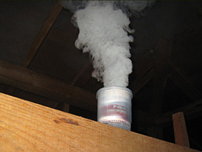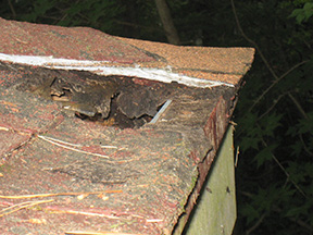 屋根にあけられた穴 翌朝は、捕獲器内のエサを奪われただけで捕獲はできませんでした。昨日の捕獲器は役所に預けたままなので、代わりに役所のものを設置したのですが、これは踏み板式でエサを食べようと踏み板をふむことでワナがかかるタイプだったのです。それに対し昨日のものは、エサに食いつけばワナにかかるので、確実性が高まるのです。踏み板式では、利口なアライグマは警戒して踏み板をふまぬようにエサだけを奪ってしまうこともあるようです。昼ごろ、応援に頼んでいた妻が昼のバスで河口湖駅に着きました。さっそくレンタカーを借りて、役場、県立の富士山科学博物館、富士吉田市中の薬局などを精力的に回りました。あのしたたかそうな母親がおいそれと捕獲できるとは思えませんので、捕獲のための情報の収集、有効と思われる薬剤・必要な物品の購入にあたるためでした。結果としては、役立ちそうな情報は得られず頼りは博物館図書室の書物だけでした。薬剤も小動物駆除の専門業者に聞いてみてくれということで、結局、自分たちだけで何とかするしか手だてはありませんでした。夕刻、前回とまったく同じ位置にエサ吊式の捕獲器を設置しました。いつものように夜に入ってエサ探しに出ていったん戻り、天井裏、間仕切壁辺りで活動する音が静まったのは10時頃で、はじめて耳にした妻はその音の激しさと不気味さに驚いていました。深夜の11時にはたぶん外へ出ていることを見越して、アライグマの追い出しに効果があるかどうかを試すために、「加熱蒸発殺虫剤」(商品名アースレッド)2ヶを屋根裏にセットしました*1。深夜の2時頃にはまた音がしましたから、もどって来ていたのでしょう。効果はあまり期待できないようでした。
