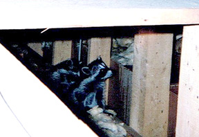 月が替わり7月1日となりました。捕獲器の中のエサはそのままで、近づいた気配は感じられませんでした。一方で、点検口からは子供のアライグマが2匹いることが確認されました。そうなると、ワナにかかるのをただ待つだけでは長期戦となる恐れがあります。こちらも疲れがたまってきたし、なんとかしなければならないが、さてどうするか、苦慮しました。考えられる作戦としては、2匹を屋根裏に閉じ込める、2匹を屋根裏から追い出す、の2点になります。前者では、閉じ込めた後の作業が難しくなりますから、後者がベターだと考え、追い出す手だてを講ずることにしました。そのためにはアライグマの行動パターンをはっきりつかむ必要があるということで、夕方から1時間ごとに天井・壁からの音のキャッチ、そして点検口からの2匹の監視をすることにしました。その結果、彼らの行動パターンは、夕方から行動を始め、薄暮の時間帯には1匹がカラマツの幹の辺りから屋根に移るなどちょろちょろしており、しばらくは屋根裏にとどまる気配でした。そして9時ごろに屋根裏に姿が見えないので外出したと判断し、その外出中に、屋根の開口部を厚いベニア板でふさぎ、彼らがもどって来ても屋根裏に入れないようにしました。その後の監視でも10時、11時になっても姿はなく、追い出しに成功したと確信し、安ど感からその夜は久しぶりに熟睡することができました。翌朝、屋根裏を確認したところ、何となんと、2匹のアライグマがスヤスヤと寝ているではありませんか。愕然としました。なぜなのか、なんのことはない、屋根にはもう1か所穴があけられていたのです。先に見つけた穴と比較して光の量が弱かったので判断できず、屋根に上がっての確認は危険が伴うために、ついうっかりして見逃していたのです。たいへんうかつなことでした。作戦失敗で力をおとしましたが、作戦としては間違いないことを確信しましたので、この日の夜、横浜駅西口行のレークライナー最終便でいったん帰宅して鋭気を養い、捲土重来を期すことにしました。